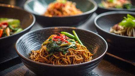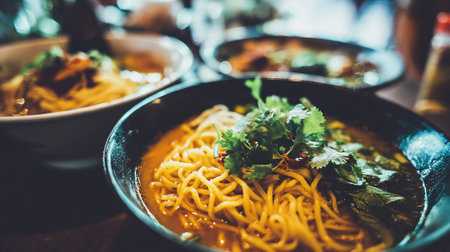 A captivating image featuring steaming bowls of delicious noodles in a cozy restaurant. The warm atmosphere enhances the dining experience with rich aromas.