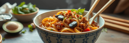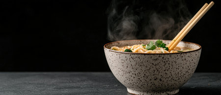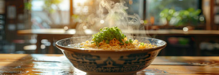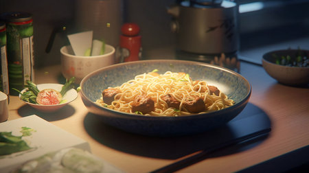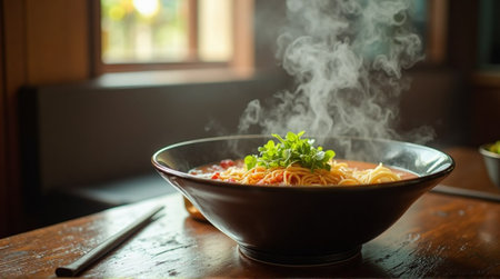 A steaming bowl of noodles sits on a wooden table, bathed in soft light, creating a cozy atmosphere. Ideal for food-related content and culinary inspirations.
