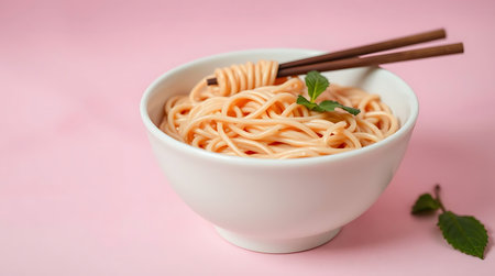 A close-up captures a bowl of steaming noodles, emphasizing their texture and warmth. The composition features a shallow depth of field, with soft lighting and a blurred background suggesting an indoor setting. This image is suitable for various commercial uses, including culinary blogs, recipe websites, and advertising.