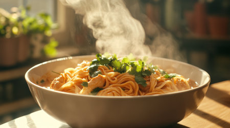 A close-up view of a steaming bowl of delicious noodles garnished with fresh herbs, showcasing the inviting textures and aroma of a perfect meal.