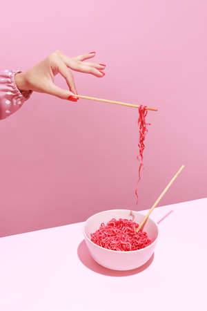Colorful image of female hand and pink noodles isolated over pink background. Japanese cuisine, culture