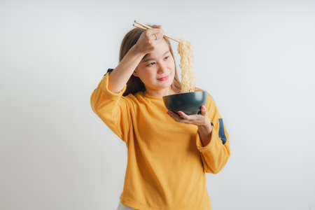 Asian girl holding a bowl of noodles with chopsticks and eating it, isolated on white background