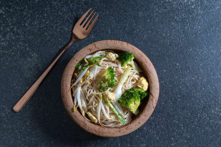 Fried chow mein Chinese noodles in bowl on black stone background close up, top view, healthy vegetarian food concept.
