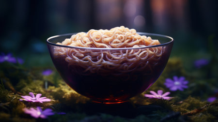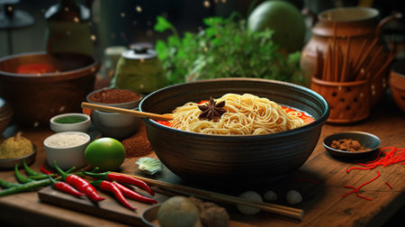 Healthy lunch of ramen noodles and fresh vegetables in crockery generated by artificial intelligence