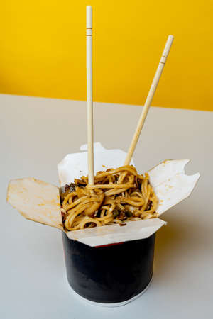 Tasty Udon noodles pasta with tempuru, shrimps wok in box delivery
