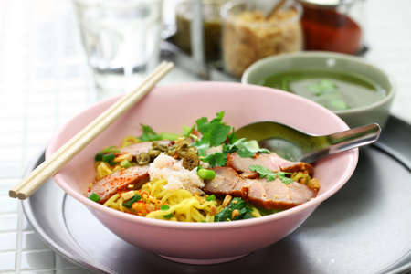 bami haeng mu daeng, egg noodles served with roast pork, thai food
