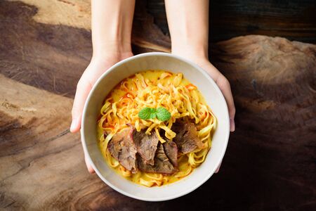 Traditional Northern Thai food (Khao Soi), spicy curry noodles soup with coconut milk and beef in a bowl holding by hand