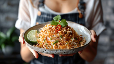 A woman holding a plate of Pad Thai noodles garnished with crushed peanuts and a squeeze of lime, ready to be enjoyed with a spicy kick of Thai chili flakes.
