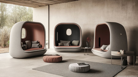 Discover a serene interior featuring modern lounge pods that blend comfort and style. Soft textures and natural light create an inviting atmosphere for relaxation.