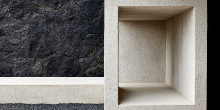 Clean lines and contrasting textures create a striking visual in this minimalist setting, showcasing a concrete structure beside a rough stone wall, promoting harmony in design.