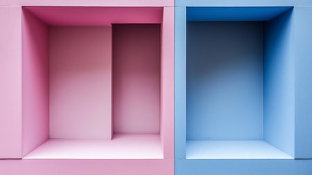 Two adjacent cubes, one pink with a dividing wall, the other blue, form an architectural wall with recessed geometric shapes and smooth, painted surfaces.