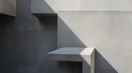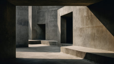 A captivating view of an abstract architectural space featuring stark concrete surfaces. Intriguing geometric shapes play with light and shadow, creating a unique atmosphere.