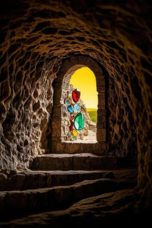 Sunset view of the entrance to a cave with colorful balloons.
