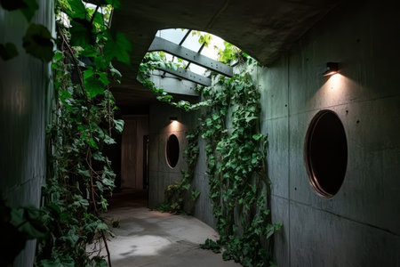 A post apocalyptic brutalist bunker, with overgrown vines creeping through cracked walls and dim emergency lights flickering.