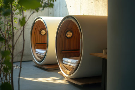 Two modern wellness pods sit in a tranquil indoor area, inviting relaxation and comfort in a cozy setting.