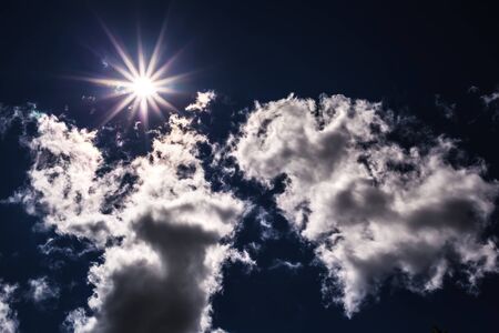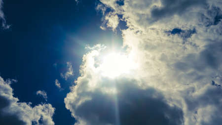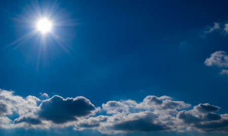 Bright rays of sun shining in blue sky. Clouds. Background.