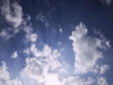 blue sky landscape with white clouds and rays of the sun. cloudy sky, white cumulus clouds at sunset, bright sky in the morning, blue sky with cloud