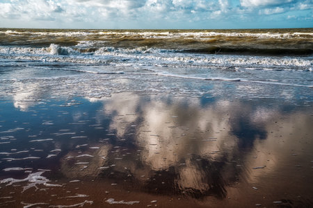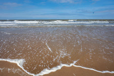 Large sand beach and sea wave in sunny day under blue clear sky at Dutch north sea coast,for summer .