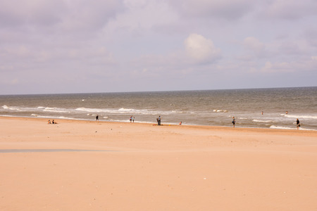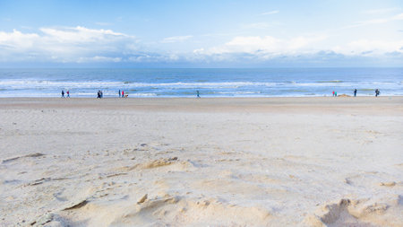 Unidentified people walking on wide sandy beach or North sea near Zandvoort in Netherlands