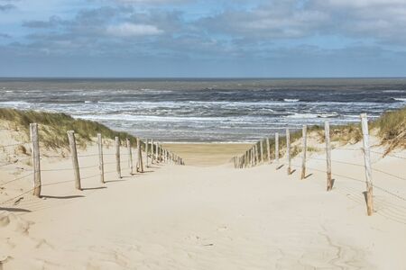 A path with many tracks, delimited by wooden posts on the sand dune with wild grass and beach in Noordwijk on the North Sea in Holland Netherlands - Panorama background sea landscape with blue sky and clouds
