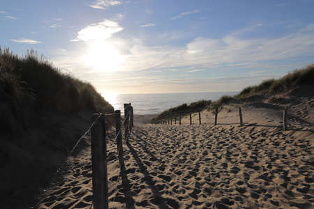 path to North sea beach in gold sunset sunshine, North Holland, Netherlands