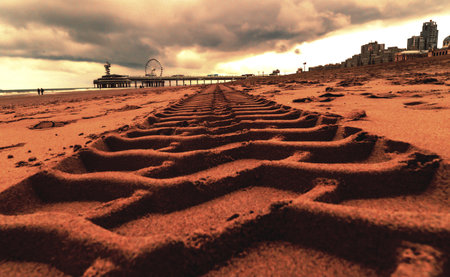 A closeup shot of tire tracks in the sand in Scheveningen pier in Hague
