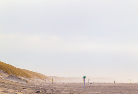 Green grass protects sandy dunes from wind on wide windy beach of North sea near Zandvoort in Netherlands in winter