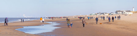 On the coast of the Netherlands many people walk around on a beautiful February day