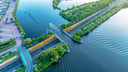 Aerial view of Veluwemeer aqueduct water bridge, which allows water and road traffic to pass over or under each other. Netherlands. Top view