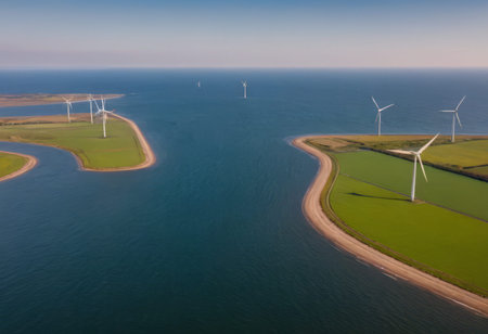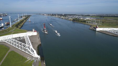 Aerial view of the Princess Beatrix sluice complex in the Netherlands with sustainable energy generating wind mills and solar panels in the background. Waterways transportation infrastructure