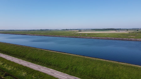 Aerial view on green polders, meadows and water transportion channel in South Beveland, Zeeland, Netherlands in summer