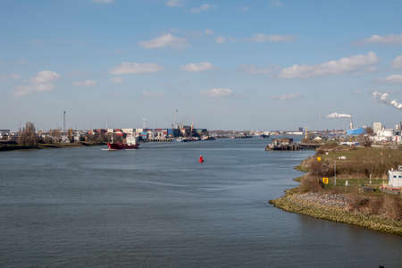 Panoramic picture from port Rotterdam with transport ships during daytime