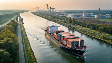 A container ship navigating a narrow canal, captured from an aerial perspective.