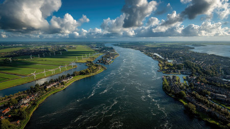 An aerial perspective showcases wind turbines aligned along a riverbank. The turbines stand tall against a backdrop of a bright blue sky filled with fluffy white clouds. The river flows through lush greenery. This image might be suitable for illustrating topics related to renewable energy or environmental themes.