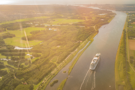 Aerial view of a cruise ship sailing through the dutch countryside at sunset