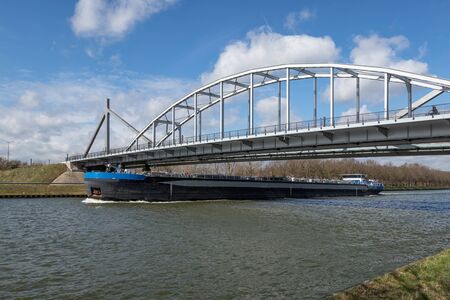 Large inland ship at Dutch Amsterdam Rijn canal passing a steel bridge