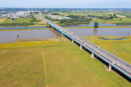 Aerial top down view of huge lowland river IJssel with highway bridge through agricultural landscape. Zwolle, Overijssel Province, the Netherlands. Drone scene in nature of Europe.