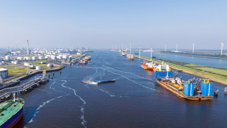 Port of Rotterdam. Botlek. Oil refinery plant from industry zone, Aerial view oil and gas industrial, Refinery factory oil storage tank and pipeline steel