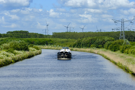 The barge Eben Haezer sailing on the Lage Vaart, one of the canals near Lelystad. It is a summer day with the green park like surrounds . In the background can be seen wind powered turbine