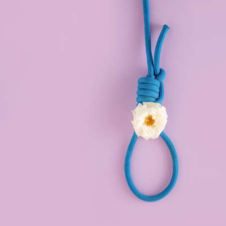 Blue hangman's noose decorated with white rose on isolated pastel purple-pink background. Emotional abstract concept of marriage, dating or wedding. Minimal flat lay. The idea of dangerous attraction.