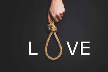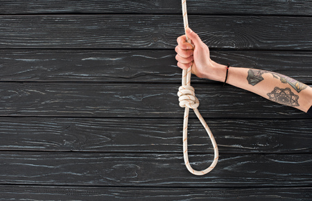 Hand holds a noose on a black background. Social problem. The end of the path