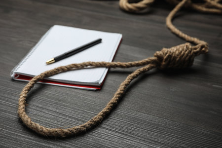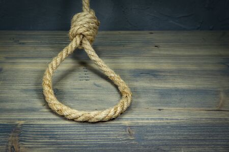 Hangman's knot on a rustic wooden table in a conceptual image of death penalty or suicide