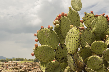 cactus with prickly pear fruits in the ruins of the ancient city of teotihuacan