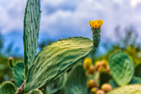 CACTUS LEAF Opuntia ficus indica, prickly pear blooming in garden