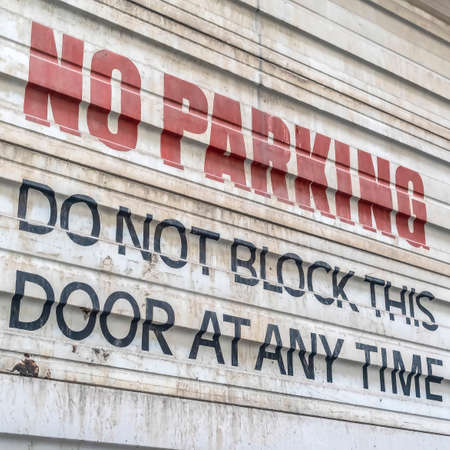 Square frame Close up of No Parking sign painted on the corrugated metal door of a building