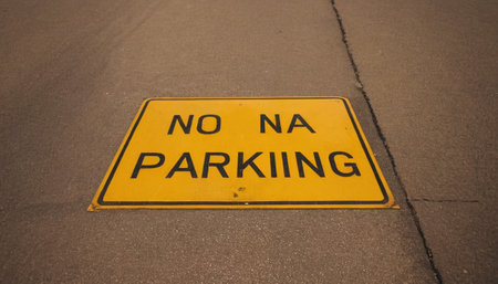 Worn and aged NO PARKING sign on black-yellow cracked asphalt