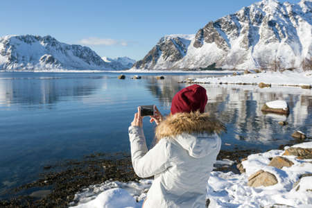 girl travels around lofoten islands and takes pictures on camera. beautiful Norwegian landscape. Norway