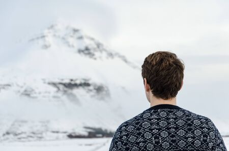 Man gazing at the winter mountain