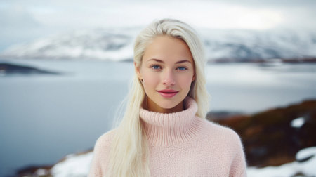 Portrait of a girl with red hair in a sweater. Traveling through northern countries. Mountains and the ocean in the background. Norway - travel