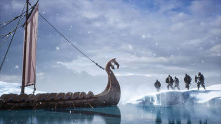 The fearless Vikings have landed on a new, unexplored snowy land. Viking ship in winter conditions. Vikings next to their Drakkar. 3D Rendering